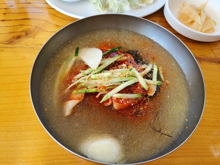 오른쪽이 보통이고 왼쪽이 대 물냉면이다. 먹다가 사리를 추가해도 되지만 끊기면 감흥이 반감하니 많이 먹을 거 같으면 처음에 그냥 대로 주문하는 것이 좋다. 여긴 신발 벗고 들어가는 식당인데 주문하고, 결제하고, 신발 벗고, 자리에 앉으면 직원분이 알아서 앉은자리로 주문한 메뉴를 가져다준다. 주문받는 남자분은 방문할 때마다 매번 동일했는데 불친절한 것은 아니지만, 무뚝뚝한 성격인 듯.