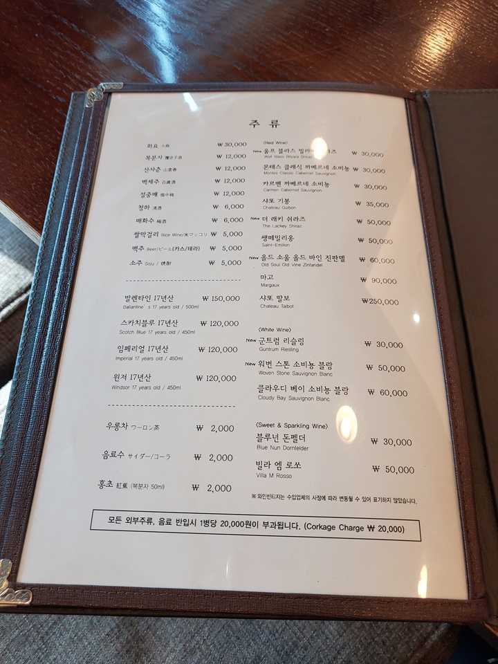 주류도 다양한데 소주, 맥주에서부터 발렌타인 17년산, 샤또딸보까지 취급한다. 외부 주류 음료 반입도 가능하나, 1병당 2만 원 콜키지 차지가 부과된다.