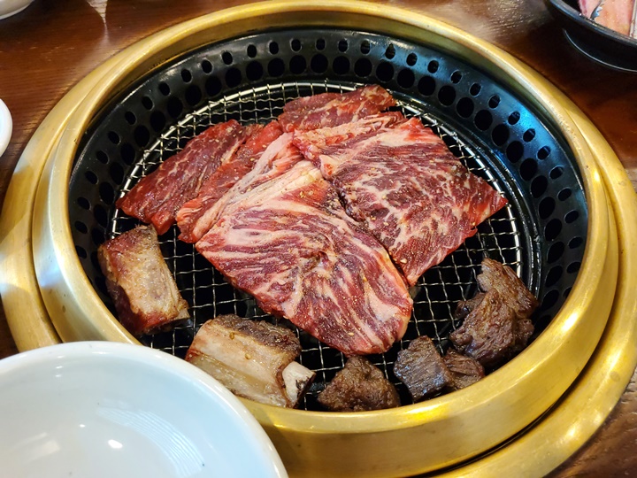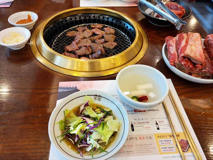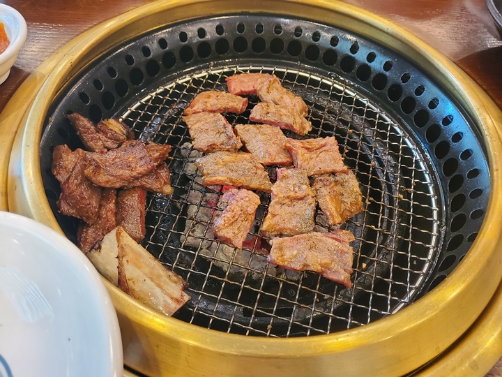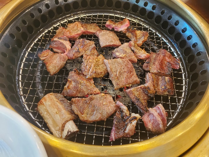 한우 양념갈비부터 굽굽 시작~ 숙련된 직원분들이 유니폼 입고 친절하고 정갈하게 응대해주시는데 때때로 고기를 올려주시고, 때때로 고기를 뒤집고, 잘라주셔서 정말 편하게 먹기만 하면 되는 곳이다.