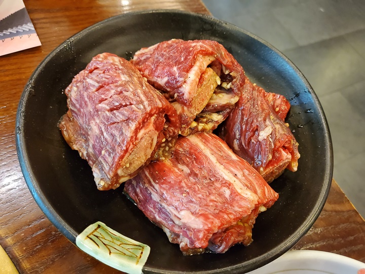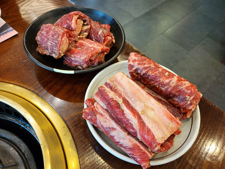 생갈비를 더 좋아하지만, 아이가 양념갈비를 좋아하기 때문에 양념갈비를 주문했는데... 한우와 미국산 가격차이가 얼마 안나 보인다. 한우 양념갈비로만 주문했는데.. 유심히 메뉴판 바라보다가 1인분 그램수 확인해보고 주문 정정했다. 한우 양념갈비 2인분, 미국산 양념갈비 2인분으로~ 양념갈비 기준으로 한우는 1인분 270g이고 미국산은 450g이다.