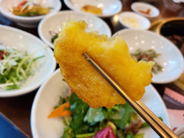 가보정 단호박전, 두툼하니 아주 맛있다. 다행(?)인 점은 아이가 요건 안 먹는다고 해서 내가 2개 먹을 수 있었다 :D 애호박전은 잘 먹으면서 단호박전은 안 먹다니...