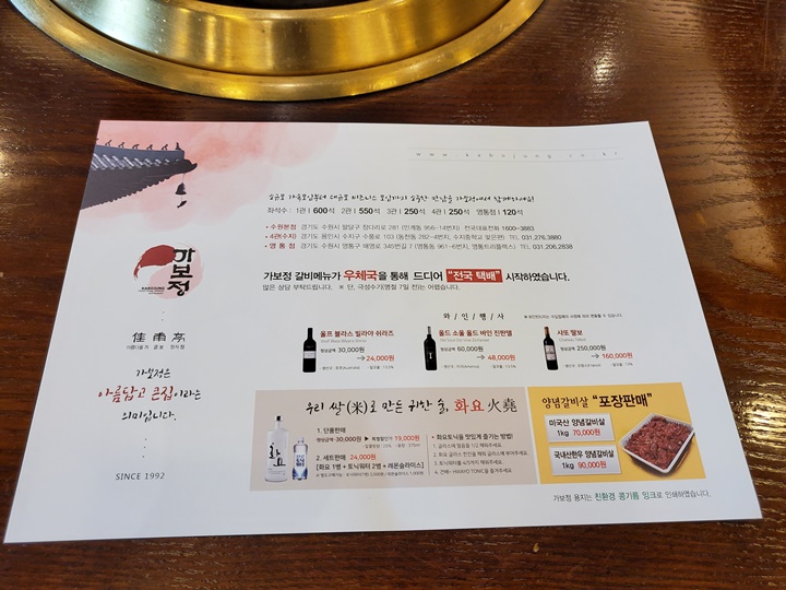 아름답고 큰 집이라는 뜻의 가보정, 수원본점 1관이 600석, 2관이 550석, 3관이 250석, 4관(수지) 250석, 영통점이 120석이나 된다. 일단 유명세에 끌려 찾아왔는데, 규모에 놀라고, 가격에 놀랄 차례이다.