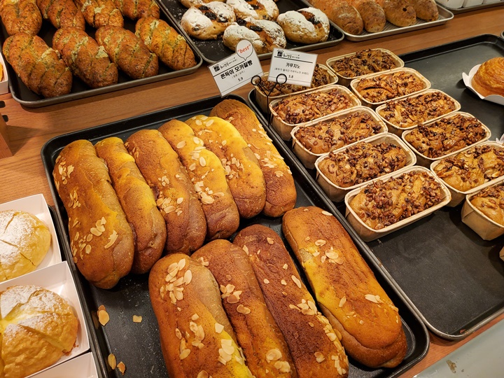 정오쯤 찍은 사진인데, 판매하는 빵 종류는 얼추 다 나와있는 것 같았다. 여유롭게 빵을 고른 후 계산대로 향했다.