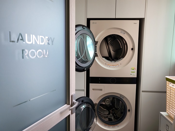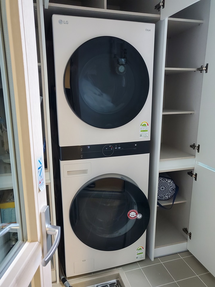 발판은 수납장 상부장 물건 꺼내고 내릴 때만 사용하고 평소엔 필요하지 않다. 엘지 오브제 컬렉션 워시타워, 보통 여자 사람이 사용하고 싶게끔 디자인하고, 보통 여자사람이 사용하기 쉽게 설계한 제품이라는 생각. 다만, 열기가 상당히 발생하므로 사용 중, 사용 후 창문을 꼭 열어두어야!!