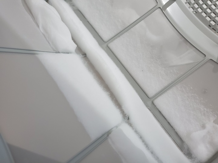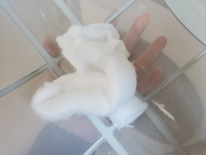 먼지망에 이렇게 보송보송 솜 같은 먼지가 가득하다. 새 수건 3회 정도 돌릴 때까지 상당량 솜뭉치가 나왔고, 이제는 붙어있던 머리카락과 잔 먼지 정도 남는 수준이다.