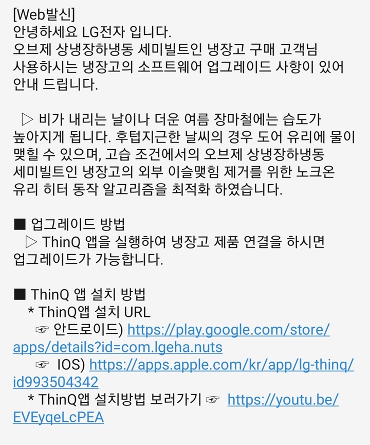 그러다 동일한 현상으로 A/S 신청했던 분이 직원분이 방문하셔서 소프트웨어 업그레이드하고 나서 문제가 해결되었다고 카톡으로 알려주시기에 우리도 엘지 씽큐 어플 설치해서 소프트웨어 업그레이드를 해보기로 했다. 이렇게 신기방기한 일이... 진짜 소프트웨어 업그레이드하고 나니 더 이상 이슬맺힘 현상이 나타나지 않는다. 7월 22일 서비스센터 직원 방문 예약을 해두었는데, 그 이틀 전날 문제를 해결해서 A/S 취소 신청을 했다.