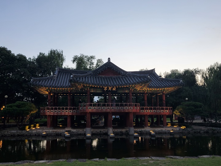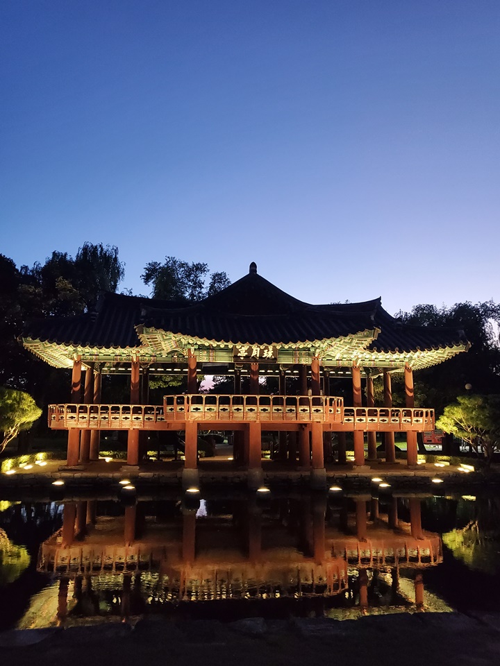 물에 비친 모습이 아름다운 완월정의 야경, 완월정에 올라갈 수도 있게 되어 있어서 전경 사진을 찍으려면 타이밍을 잘 맞춰야 한다.