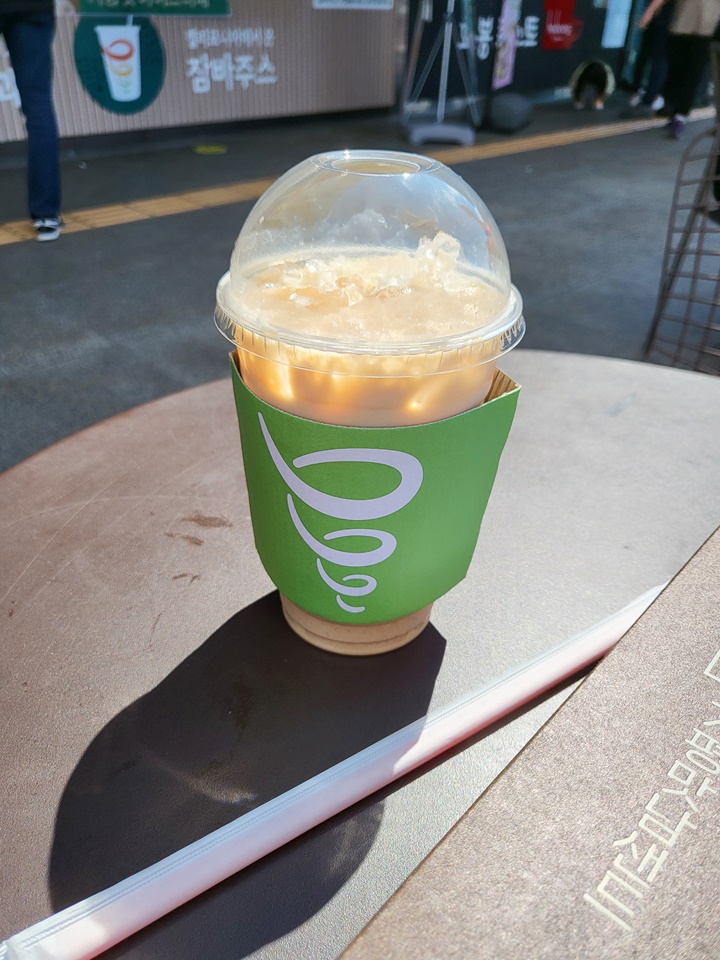 얼음 동동 미숫가루 비주얼의 잠바주스 잣라떼와 가평맛남샌드, 아이는 던킨도너츠가 먹고 싶다며 던킨에 다녀왔다.