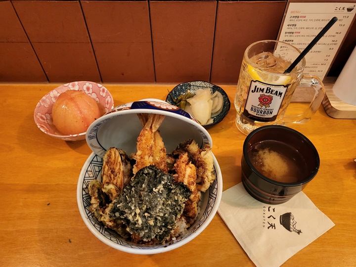 어른 둘은 각각 고쿠텐동, 아이는 로우텐동을 주문했고 유자토마토와 하이볼 한잔 추가했다. 테이블 자리라 끝에 앉은 남편 몫의 고쿠텐동은 사진에 안나옴 ㅋㅋㅋ 여튼 이렇게 주문하니 41,000원이었으니 가성비 좋은 점심식사라고 할 수는 없겠으나 배불리+매우 맛있게 먹고 나왔으니 만족도는 100% 그 이상이었다.