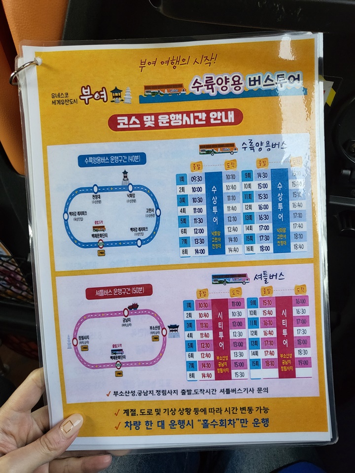 탑승 가격이 아깝지 않았던 수륙양용버스 40분 투어 끝, 아이는 이거 너무 재미있어서 40분 순삭 했다면서 좋아했다. 이후 육상관광은 자유여행으로 백제문화단지, 고란사, 낙화암, 부소산성, 궁남지, 정림사지 등을 둘러보면 된다.