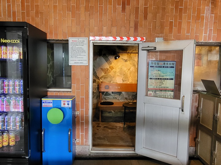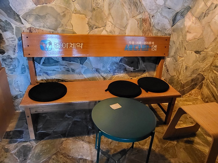 그냥 나오기 아쉬워 사진으로 담아본 한증탕 사진, 여기서 맥주 마시면 찐맛일 듯!! 동아제약 벤치도 탐나고 등밀이 기계도 신기하다.