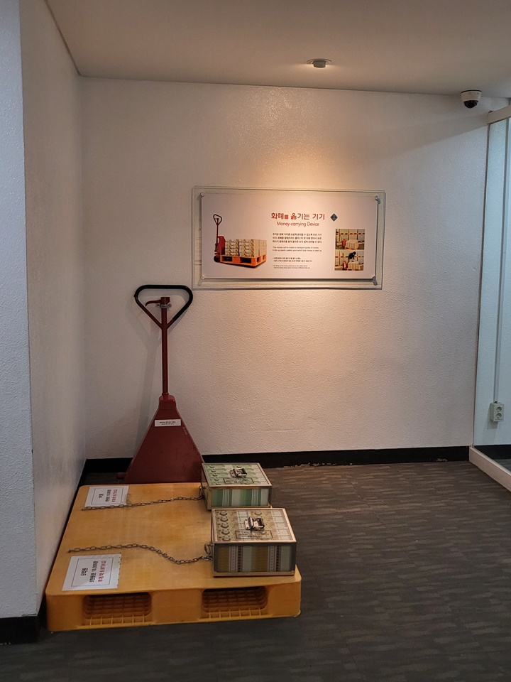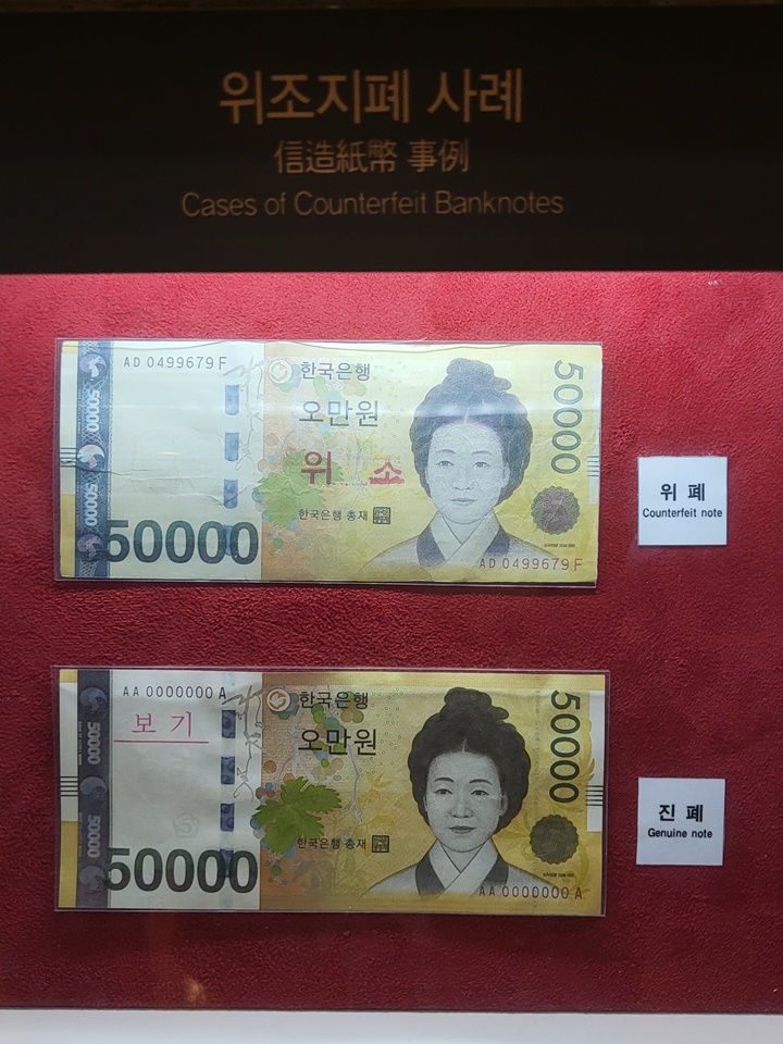 위조지폐 사례도 전시되어 있었는데 일반인이 얼핏 보면 판별하기 쉽지 않을 정도로 정교했다. 여러 판별장치가 있지만 바쁠 때 보면 위폐인지 진폐인지 알아차리기 어려울 것 같은?