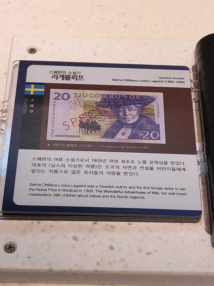 대륙별로 나라를 분류하여 각 권종 지폐를 전시해두었다. 특징이 있는 지폐 디자인은 따로 설명해둔 코너도 있는데 꽃 그림이 그려진 노르웨이 지폐, 독일의 동화작가 그림형제나 스웨덴의 소설가 라게를리프 등 작가가 그려진 지폐도 있었다. 우리나라 지폐에 작가가 등장한다면 누가 될까?