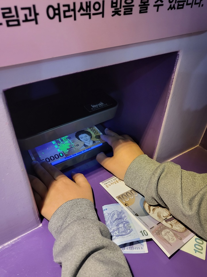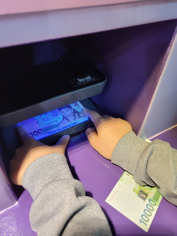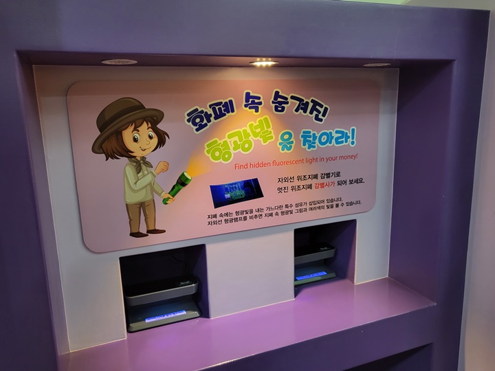 체험학습실에 자외선 위조지폐 감별기도 있다. 지폐 속에 형광빛을 내는 특수 섬유가 삽입되어 있어서 자외선 형광램플로 비추면 그림이 보인다. 직접 확인해보는 것도 재미있으니 권종별로 지폐 챙겨가면 좋다.