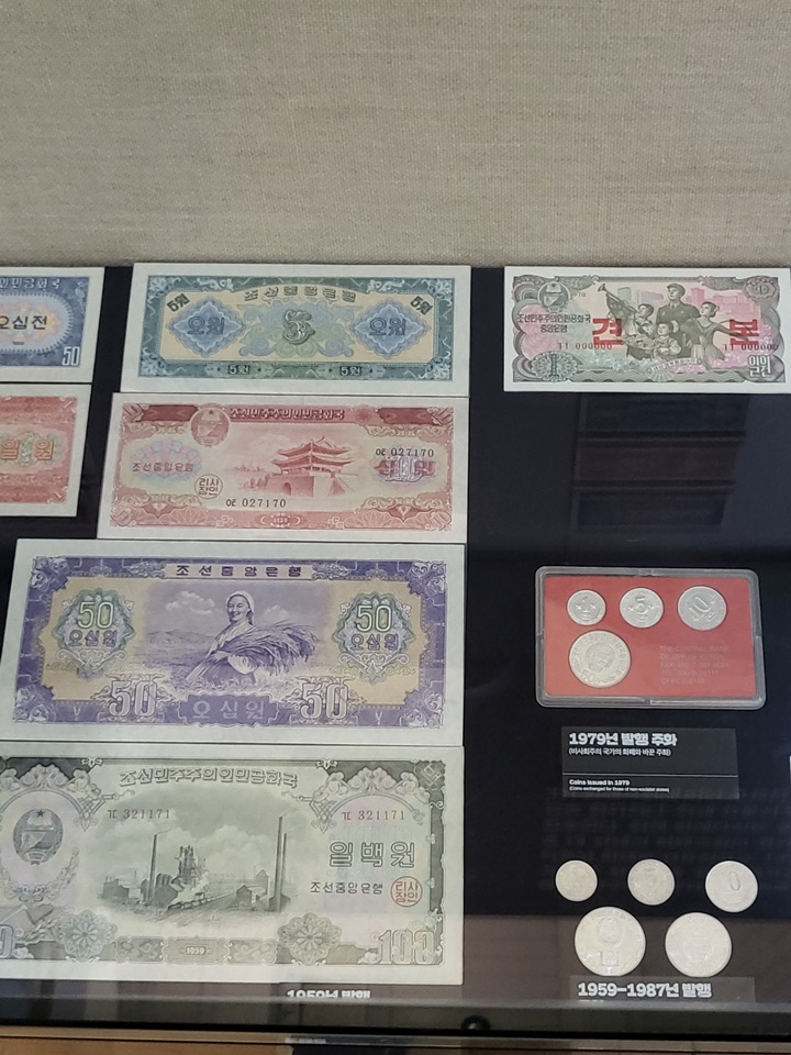 처음 보는 북한돈, 조선민주주의인민공화국 무역은행 '외화와 바꾼돈표'라는 문구가 인상적이다. 발행시기별 디자인을 모아두어서 화폐의 변천사도 한눈에 알아볼 수 있게 전시해두었다.