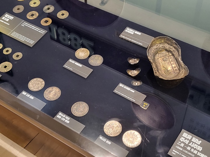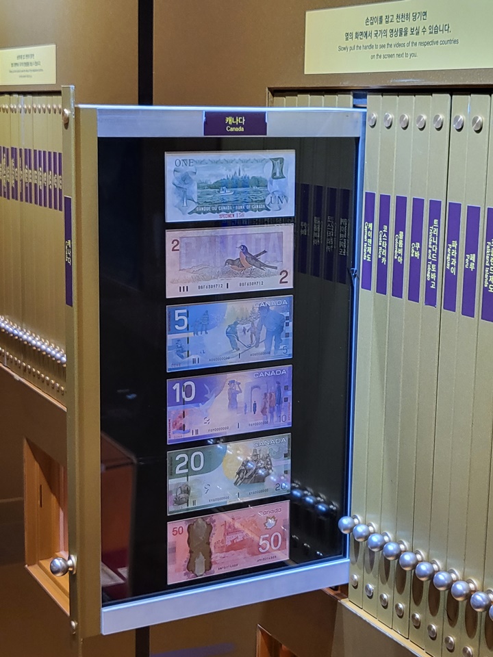 1층에서 가장 넓은 공간을 차지하는 화폐광장은 각종 지폐와 기념지폐 및 주화가 전시되어 있어서 눈이 즐겁다. 우리나라 화폐만 보다가 익숙하지 않은 나라의 처음 보는 긴급통화 등을 보니 신기하면서도 디자인에 상당히 신경 썼구나 하는 생각도 들었다.
