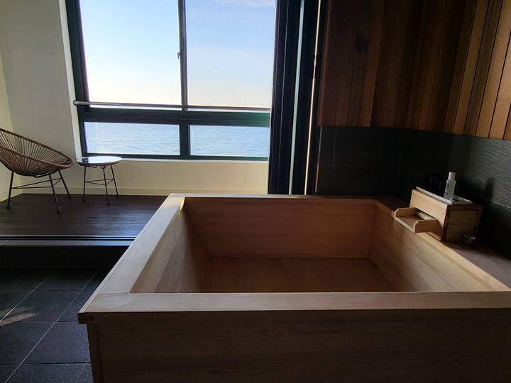 대천 토모노야가 석식, 조식이 포함되어 있기는 하지만 그래도 가격대가 있는 편이다. 그래서~ 딱 체크인 시간 맞춰서 입실하고, 가급적이면 체크인하자마자 히노끼탕을 만끽하길 권한다. 왜냐면 밤에는 어두컴컴해서 바다가 안보이고, 다음날 아침에는 갯벌로 변신(?)해있기 때문에 이 시간대에 맘껏 즐겨야....!!