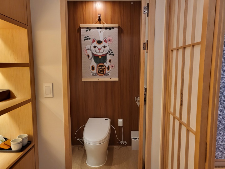 왼쪽에 비데가 설치된 화장실이 따로 있다. 화장실 안에 디퓨저가 비치되어 있어서 은은하고 기분 좋은 향이 난다. 거제 토모노야 다다미 트윈은 화장실에 아담한 사이즈의 세면대가 있었는데, 여기는 다다미방 안쪽으로 세면대가 있는 구조였다.