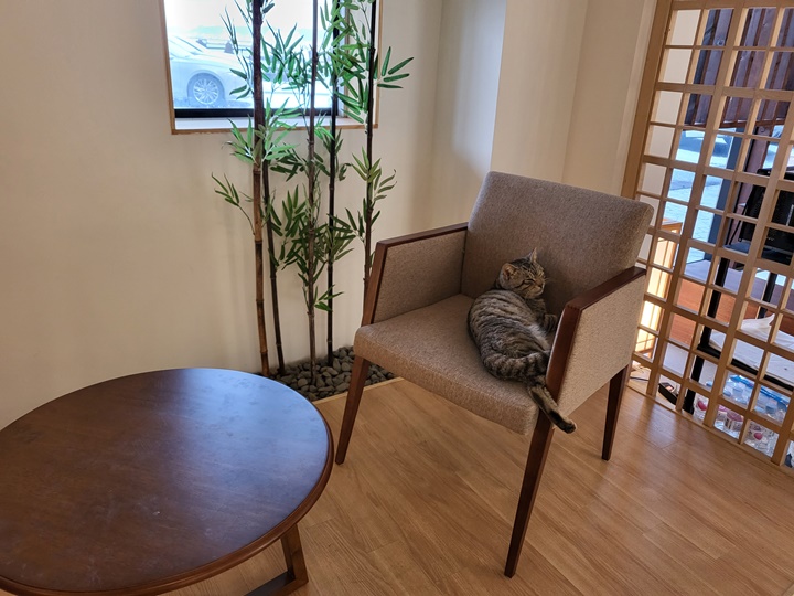 식사를 마치고 객실로 돌아오는 길, 주차장에서 야옹야옹하면서 따라오는 네코짱을 만났다. 목걸이를 하고 있지 않길래 그냥 넉살 좋은 길고양이인 줄 알았다. 로비 안으로 들어오려고 하길래 저쪽 문으로 돌아서 들어왔는데.... ㅎㄷㄷ