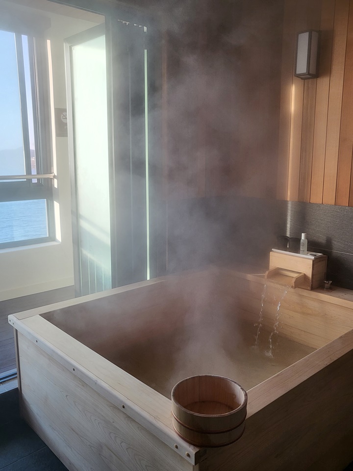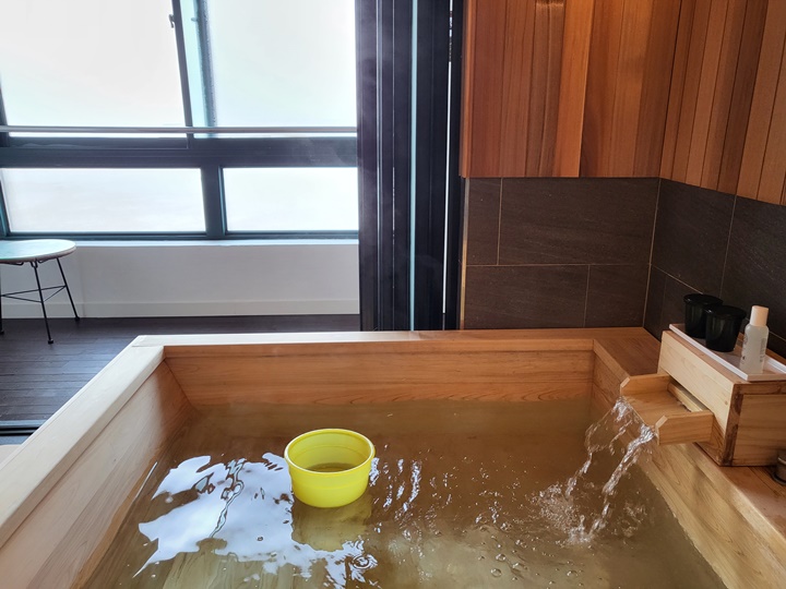 욕조 옆 발코니 폴딩 도어를 열면 개방감이 아주 좋아서 흡사 노천탕을 즐기는 기분까지 맛볼 수 있다. 히노끼 욕조 크기는 거제점에 비해 조금 작은 듯했는데 아이 동반 3인 가족이 이용하기에는 넉넉한 사이즈였다. 거제점 욕조가 워낙 컸음 ㅎㅎㅎ
