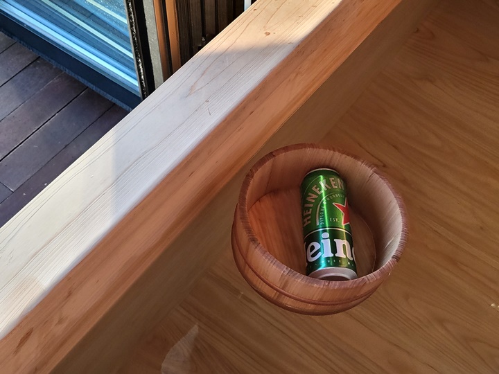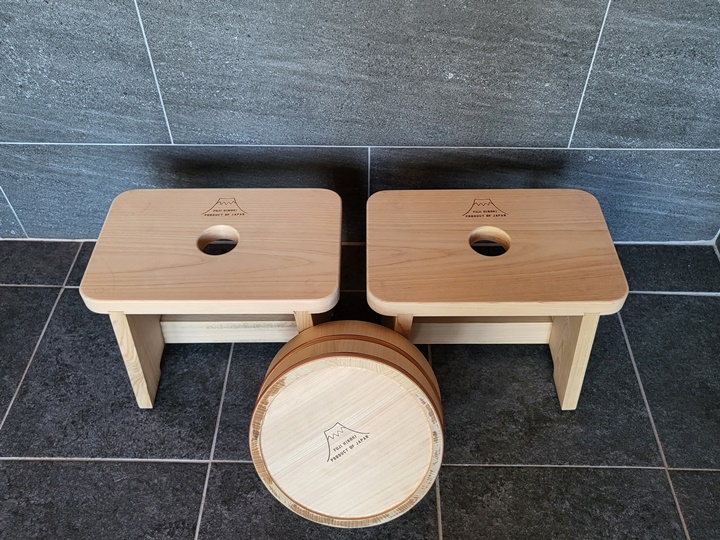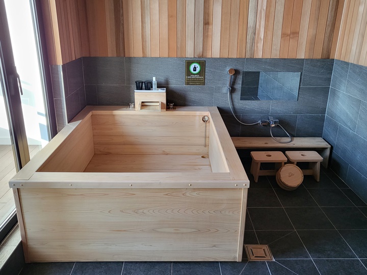 대형 히노끼탕, 고퀄 히노끼 의자와 바가지도 신상 숙소답게 컨디션이 매우 양호했다. 욕실에 들어가는 순간 히노끼 향이 가득한데 욕조에 물을 채우면 점점 향이 짙어진다. 일단 후각만으로도 절로 힐링이 된다.