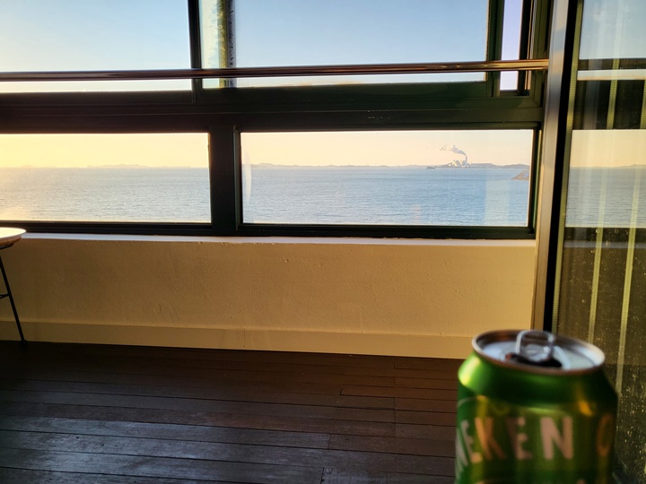 방 안쪽 문을 열면 베란다가 있는데, 거기에도 방석과 좌탁을 두었다. 난방이 매우 잘되어서 방이 후끈후끈한데, 여기 나가 있어서 시원하다. 창문을 통해 바다도 잘 보인다!
