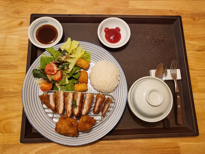 어린이용 석식 돈가스에 샐러드, 장국이 제공되었다. 담음새가 귀엽지만 메뉴가 딱히 맛있거나 그렇지는 않음;;;