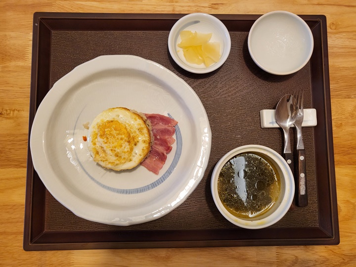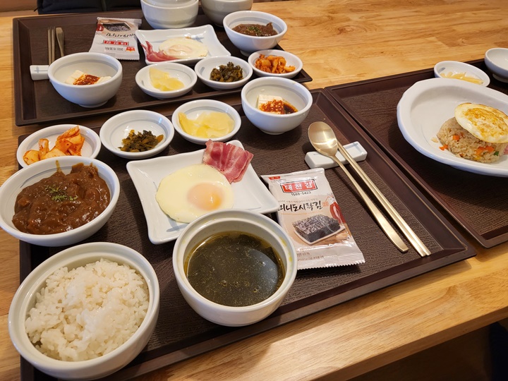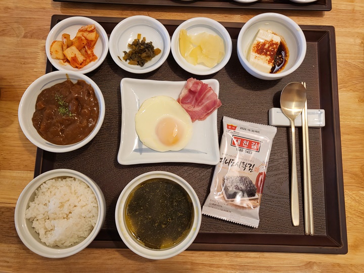 어른용 조식은 밥과 미역국, 카레, 달걀후라이와 베이컨, 김, 연두부, 김치 등으로 푸짐하게 보이지만 맛은 보통이다.