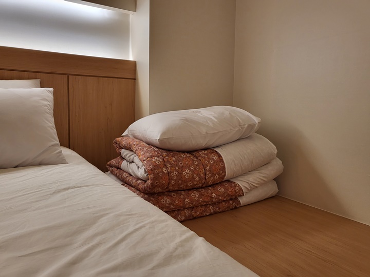 더불어 방에서 잠을 자지 못하고 다다미방에 이불을 깔고 세 식구가 잤는데... 그 이유는 방에서 수도관 웅-웅- 거리는 소리가 밤 시간 내내 지속되었기 때문이다. 우리 방만 이런 걸까? 다른 손님들은 별 후기가 없었나 싶어서 찾아보니 내 귀에만 들리는 게 아님은 확실했다 ㅠㅠ 다다미방에서는 소리가 거의 들리지 않아 괜찮았지만 큰 사이즈 욕조나 자쿠지를 품은 숙소라면 수도관, 하수관 소음은 해결해야 할 숙제인가 보다.