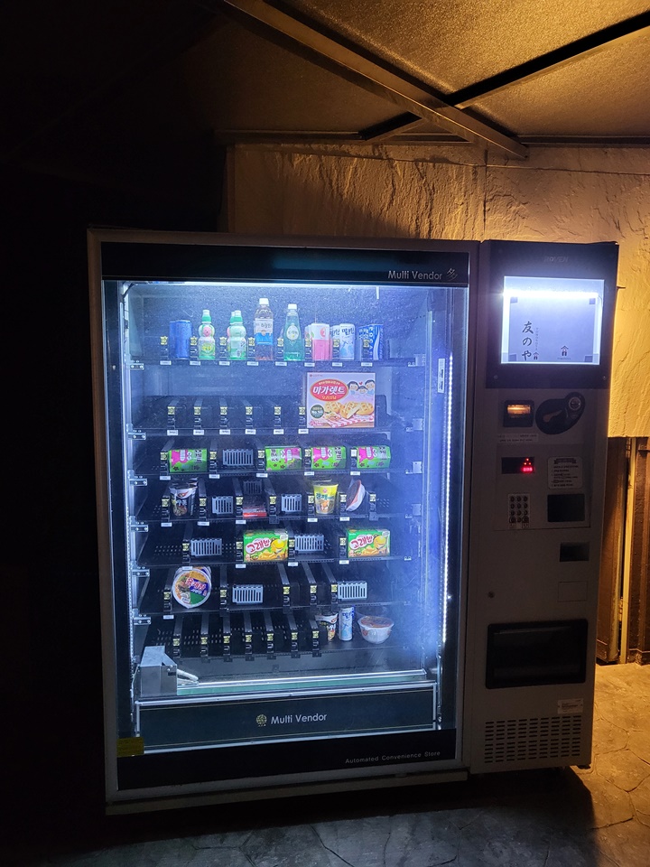 토모노야 호텔에도 자판기가 있어서 라면이나 과자 같은 것을 사 먹을 수는 있는데, 근처에 (거의) 아무것도 없으므로 미리 약간의 간식은 챙겨가는 것이 좋다. 냄새나지 않고, 착색되지 않은 음식류로... 목욕할 때는 뭐니 뭐니 해도 빙그레 바나나맛 우유가 최고 ㅋㅋㅋㅋ