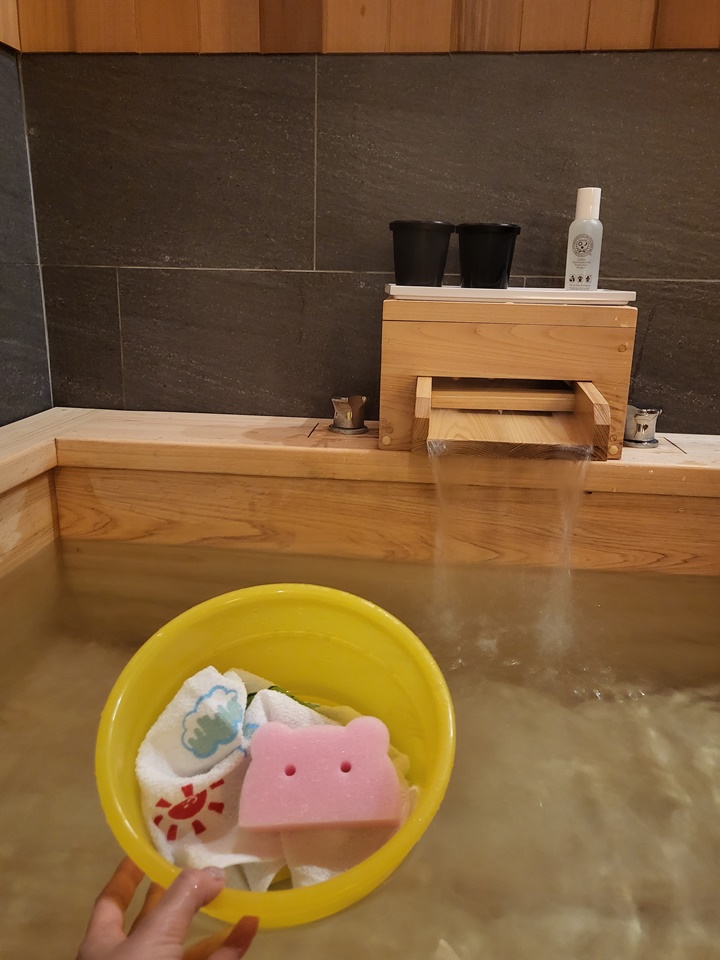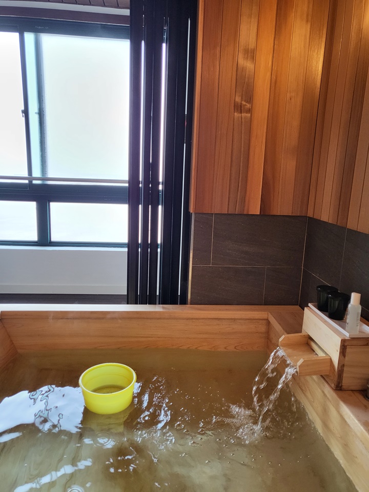 아침 먹으러 가기 전에 욕조에 물을 틀어 놓고 나왔는데 밥 먹고 올라가니 물이 딱 맞게 채워져 있었다. 체크아웃 시간까지 여유가 있으므로 마지막으로 히노끼탕에 입수 :D