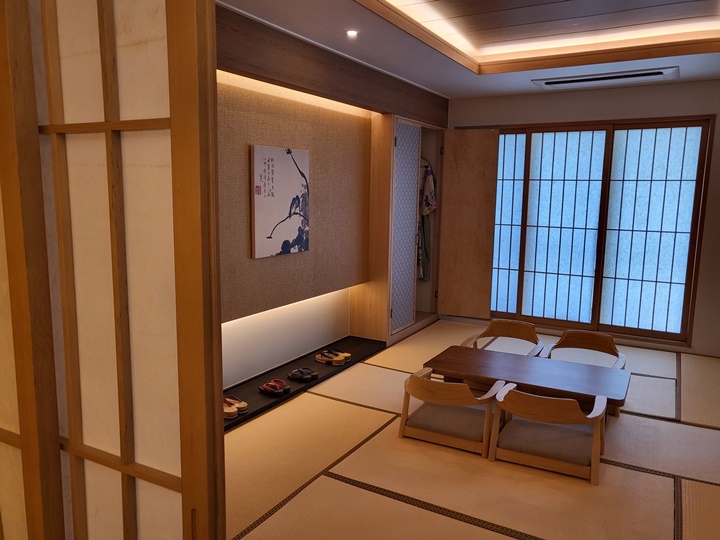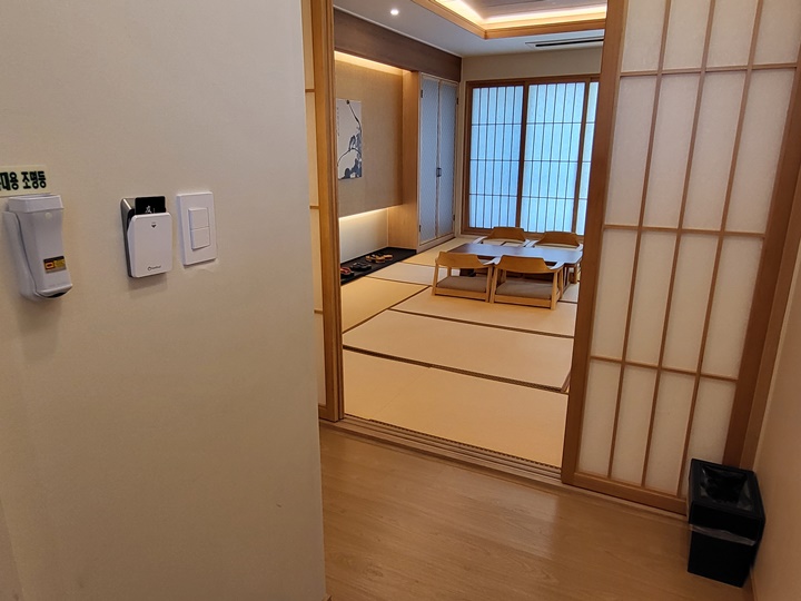 TATAMI SUITE DOUBLE 다다미 스위트 더블 카드 객실 키 꽂고, 신발 벗고 마루 위로 올라간다. 약간씩 단차가 있고 다다미방에 미닫이문으로 되어 있다.