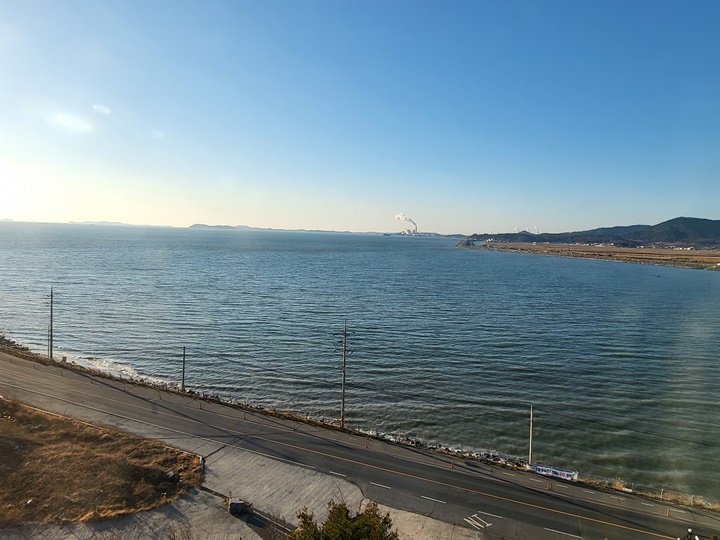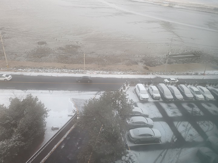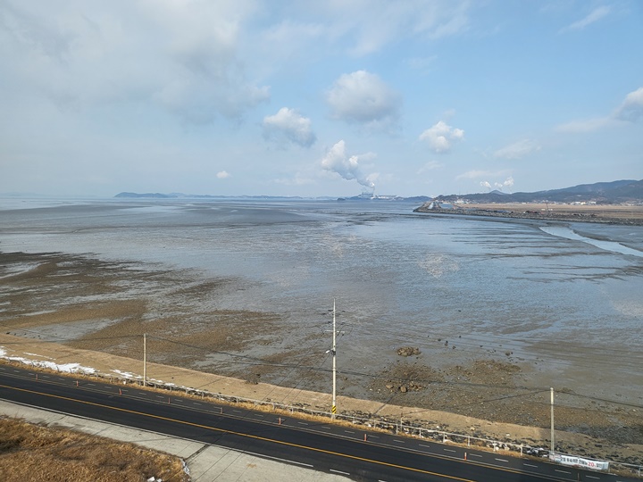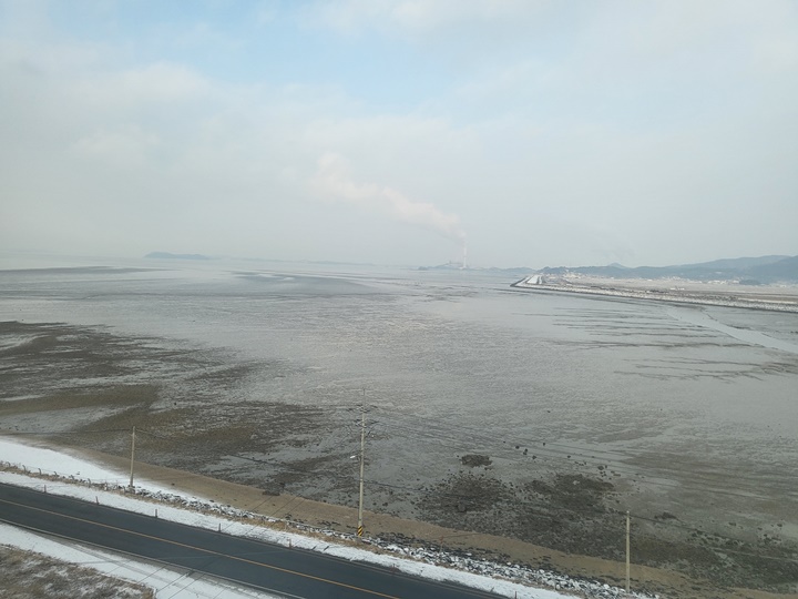 체크아웃하기 직전에 대천 토모노야 료칸 & 호텔 다다미 스위트 더블 703호에서 찍어본 길고 긴 서해안 갯벌, 차량 위로 쌓였던 눈은 녹은 건지 치워주신 것인지 흔적도 없이 사라져서 다행이었다.