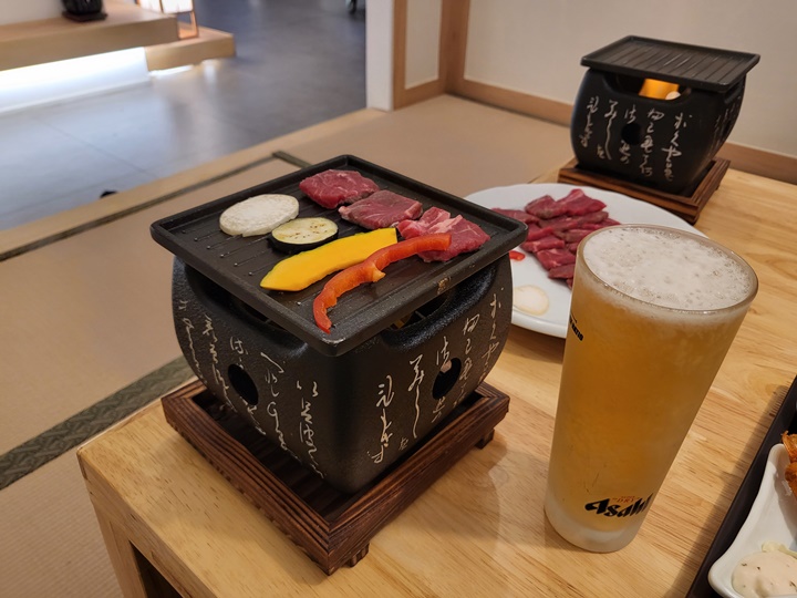어른용 석식은 화로구이, 고기와 채소 양이 많지 않지만 밥이랑 같이 먹으면 은근히 배부르다. 아사히 생맥주는 8,000원이고 식사를 마친 후 고치소에서 결제를 하면 된다.
