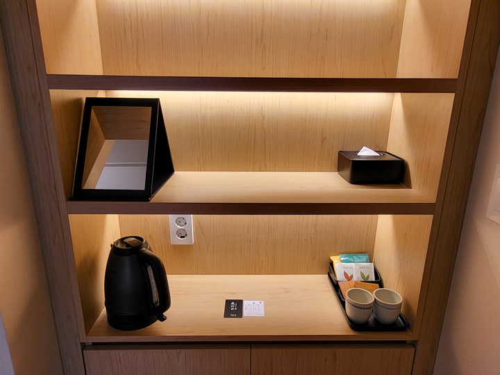 화장실 옆으로 전기포트와 각종 차류, 미니 냉장고가 준비되어 있다. 냉장고 안에는 생수 3병이 들어 있다. 거울과 콘센트, 여유공간 때문에 머리 말리기와 화장은 이쪽에서 했다.