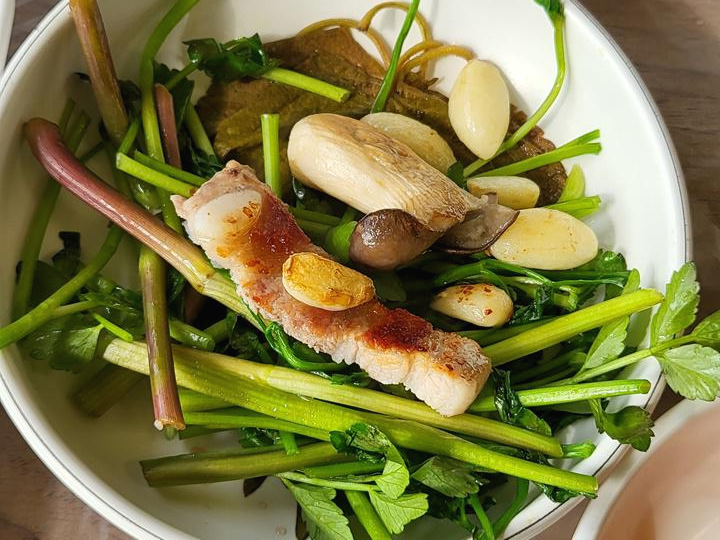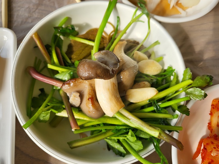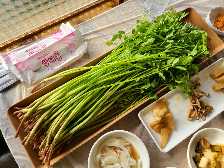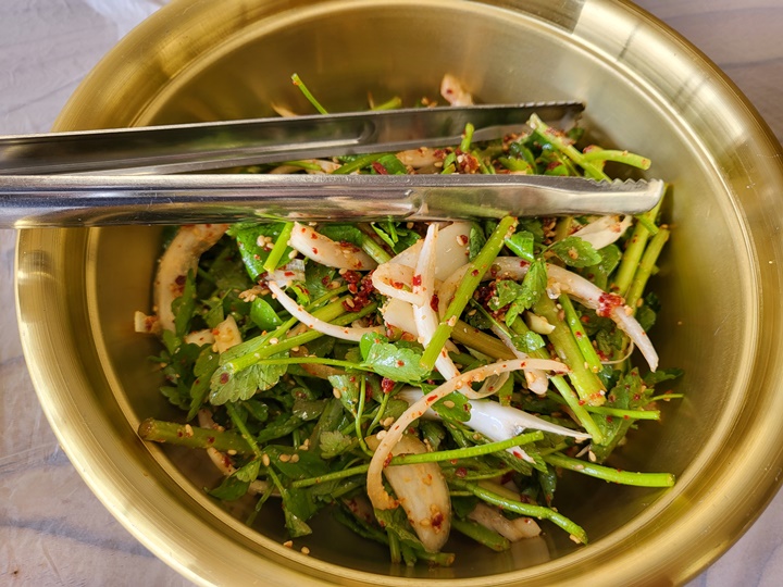 남편이 꼭 먹고 싶다며 주문한 미나리 겉절이, 그리 맵지 않아서 아이도 먹을 수 있을 정도였다. 이거 안 먹었으면 서운할 뻔했다면서 양푼이 하나 담긴 겉절이를 거의 혼자서 다 먹었다. 내 입맛에는 그냥 보통 느낌이었는데, 오리고기랑 미나리 겉절이 같이 먹으면 더 맛있게 느껴지는 건가 싶기도 하고..