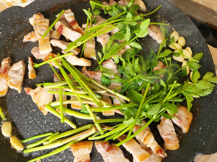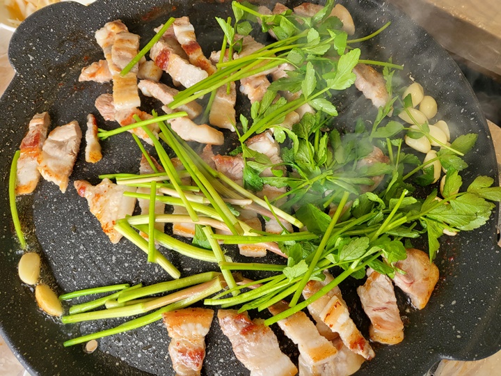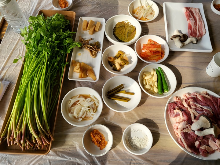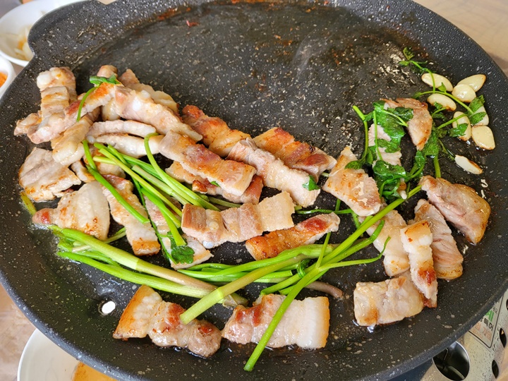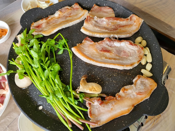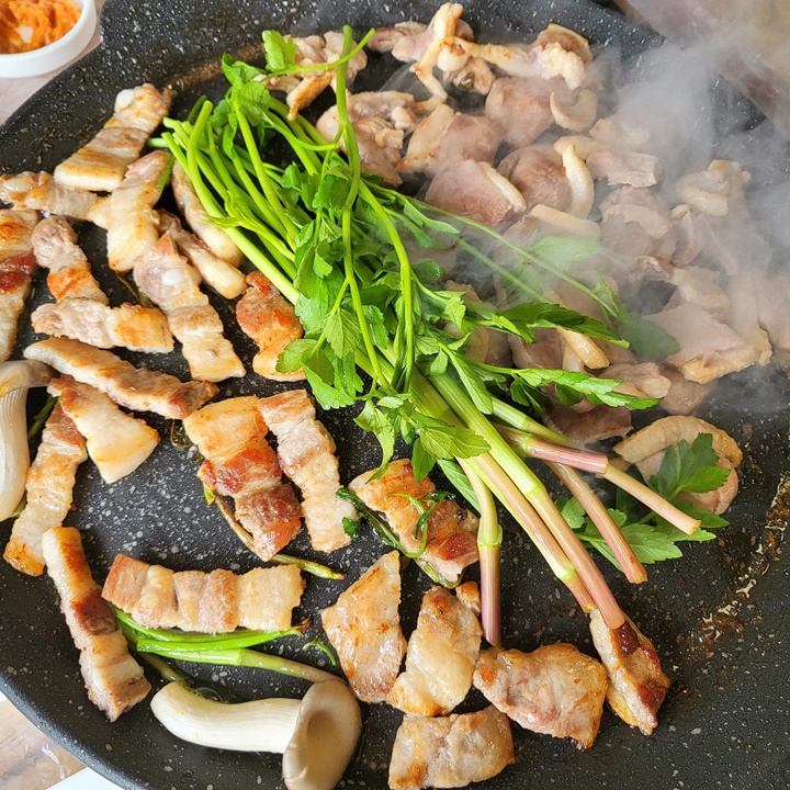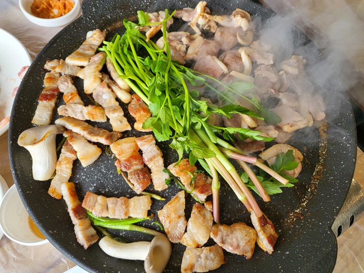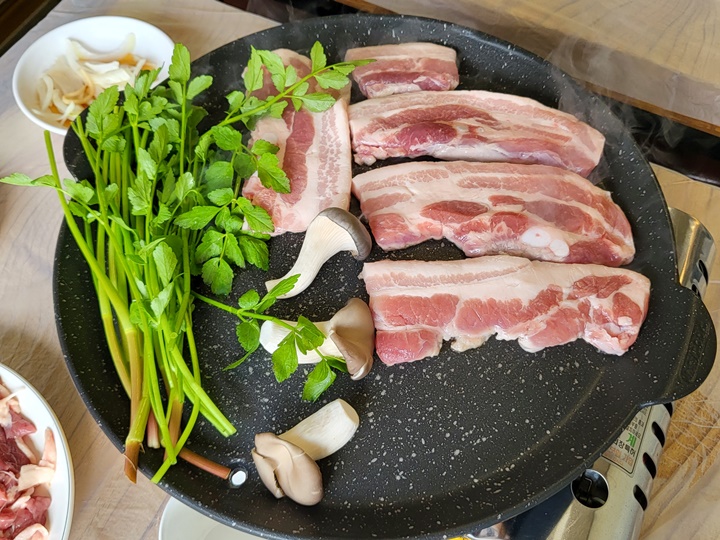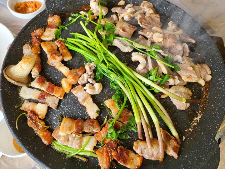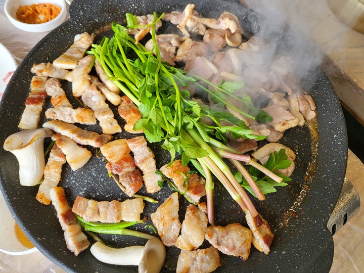삼겹살과 오리고기 나온 후에 미나리가 나와서 예쁜 떼샷을 담지 못했다. 이미 삼겹살 대부분은 불판 위에 굽고 있는 상태라 ㅎㅎㅎ