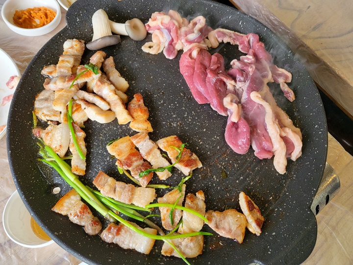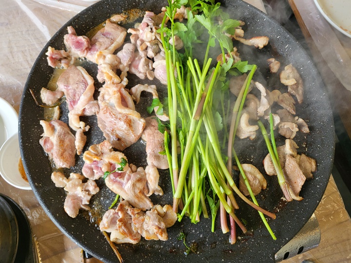 먹다가 끊기면 안 되니까 삼겹살 다 먹어갈 즈음 불판 반쪽 나눠서 오리고기도 올렸다. 오리고기도 좋아하지만, 미나리와의 합은 역시 삼겹살이 더 맛있는 거 같다.