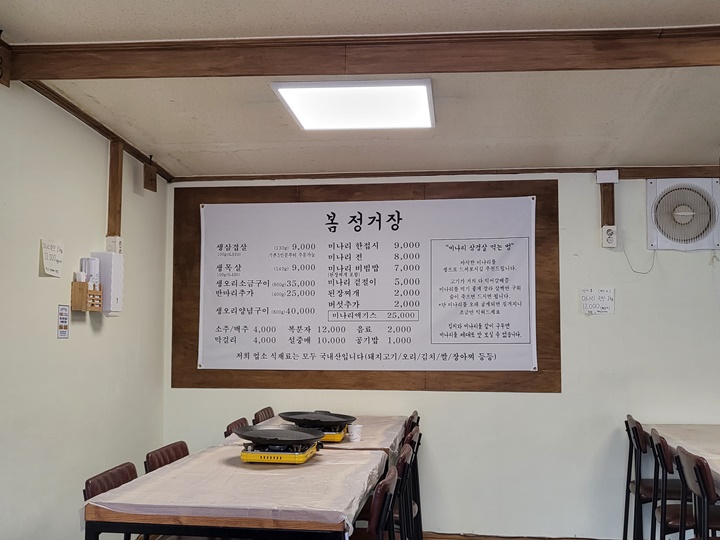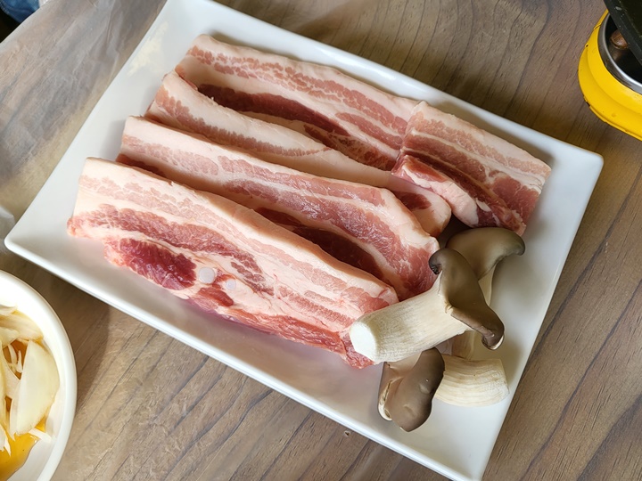 어쩌다 보니 첫 번째 손님, 가게 문 여는 시간에 들어가서 손님은 아무도 없었다. 하기야 오전 10시부터 삼겹살 먹는 사람이란 ㅎㅎㅎ 매장이 깨끗하고 사장님도 완전 친절하다. 안쪽으로 좌식 테이블도 있어서 단체, 가족단위로 오기에도 좋을 것 같다. 나중에 화장실 가는 길에 살짝 보니 화장실은 물론이고, 주방도 진짜 깔끔하게 유지하고 있어서 다음에 또 와야지, 생각했다.
