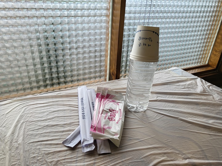 마실물과 종이컵, 나무젓가락이랑 물티슈는 인원수에 맞춰 가져다주시고, 냅킨은 벽면에 부착되어 있는 거 뽑아서 사용하면 된다. 삼겹살 기름이 많이 튀기니까 테이블마다 위생시트를 깔아 세팅해두어 깔끔했다.