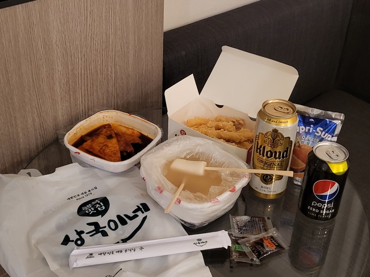 편의점에서 각자 좋아하는 음료수 하나씩 골라서 야식을 먹기 시작하는데... 불과 2시간 전에 소고기 육회 등등 먹고 왔는데 이게 또 들어가다니... 역시, 고기 배랑 떡볶이 배는 따로인 게 맞나 보다 ㅎㅎㅎ