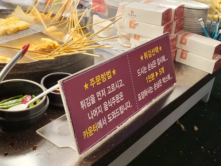 튀김을 구입할 경우, 튀김을 먼저 고르고 나머지 음식 주문은 카운터에서 하면 된다. 매장에서 먹을 경우엔 접시에, 포장 시 박스에 원하는 튀김 종류를 담아서 주문 시 드리면 다시 한번 튀겨서 포장해준다.