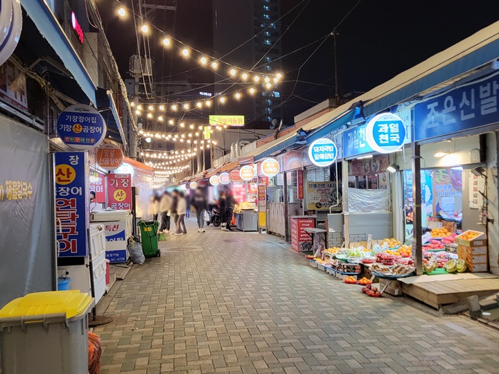 해운대에 도착했더니 밤 10시쯤... 호텔 체크인을 하고 어느 정도 짐 정리를 마친 후 부랴부랴 향한 곳은 바로 해운대 전통시장이다. 배불리 고기를 먹고 왔지만, 아이가 상국이네 물떡이 꼭 먹고 싶다고 그래서 야식 포장하러 나온 것. 평일 밤 10시 20분쯤이라 주말이나 연휴 때와는 달리 한산한 편이었던 시장 풍경~