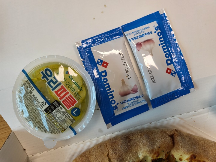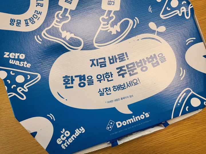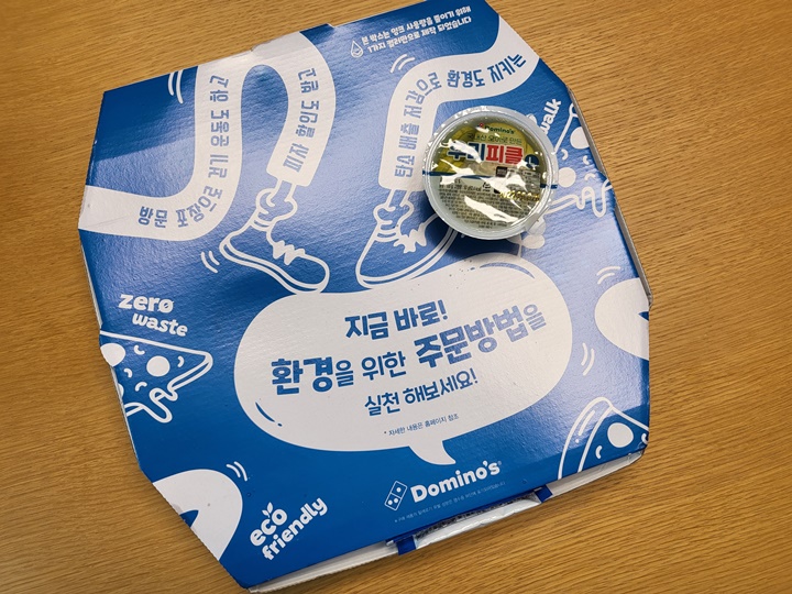추가 제공되는 일회용 포크, 피클 및 소스류가 필요하지 않을 경우엔 제로 웨이스트 참여하기! 제공받지 않기 희망하면 선택하면 된다. 일회용 포크랑 핫소스는 필요 없지만, 우리피클이랑 갈릭디핑소스는 필요하므로 제공받기로 했다. 피자가게 피클 중 도미노피자 우리피클이 제일 맛있어서 아주 좋아한다:D