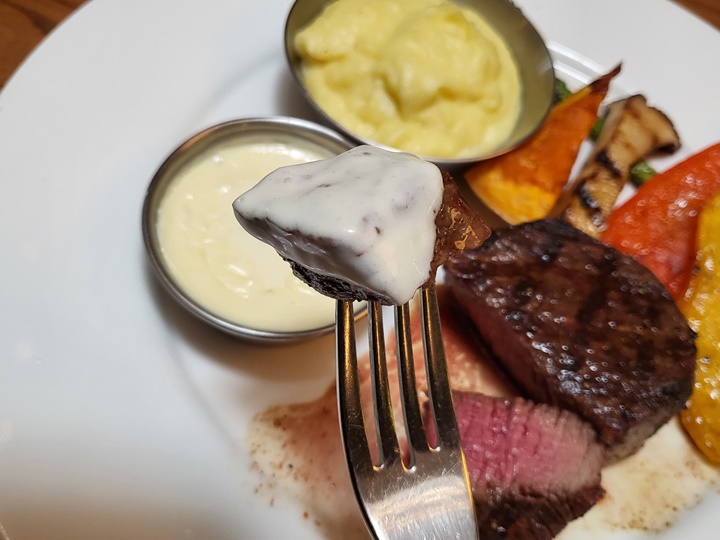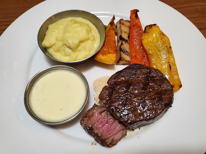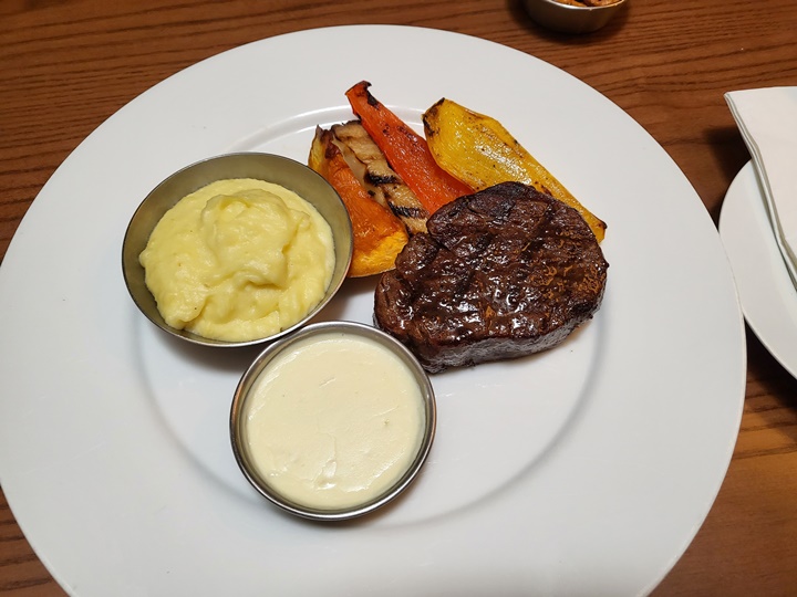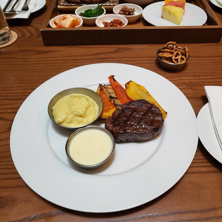 안심 스테이크가 180그램이라 한입거리이지만, 명색이 호텔 라운지니까 여러조각으로 나눠서 천천히 먹어보기로 한다. 굽기는 미듐웰던으로 선택했는데 아주 천천히 먹었기 때문에 나중에 먹을 땐 핏기가 거의 보이지 않을 정도였다. (접시가 매우 뜨거움)