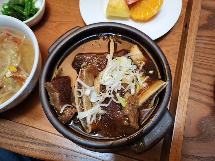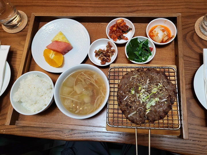 아이가 먹으려고 주문했던 언양불고기. 국내산 쌀밥과 국내산 배추김치 포함 총 4종의 반찬과 북엇국, 메인인 언양불고기가 나오고 후식으로 오렌지, 수박, 파인애플의 과일 3종이 나온다. 솔직히 별로 맛이 없다. 특히 메인인 언양불고기가... 후식인 과일만 먹을만했고... 다음에 다시는 주문하지 말자고 생각한 남대문 코트야드 메리어트 모모카페 런치 단품 메뉴였다.