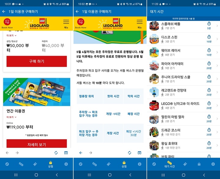 레고랜드 즐기기 꿀팁 춘천 레고랜드 테마파크 입장에 앞서 레고랜드 앱을 스마트폰에 깔아두면 편리하다. 탑승, 줄서기 시간 등을 알아볼 수 있는데 줄서기 시간은 레고랜드 내에 있을 때만 확인 가능하다. 대기시간이 실제랑 완전 일치하는 것은 아니니 참고용 정도로만 생각하는 것이 좋다. 20분 기다리면 된다고 했는데 30분 넘게 기다리기도 했다...