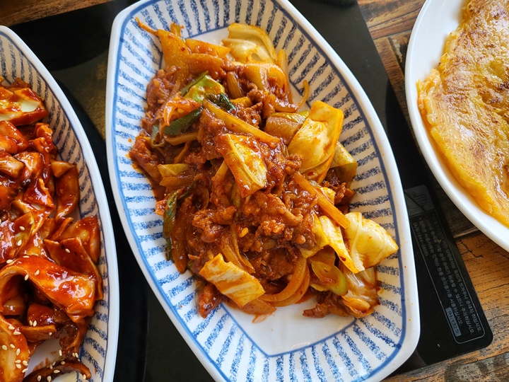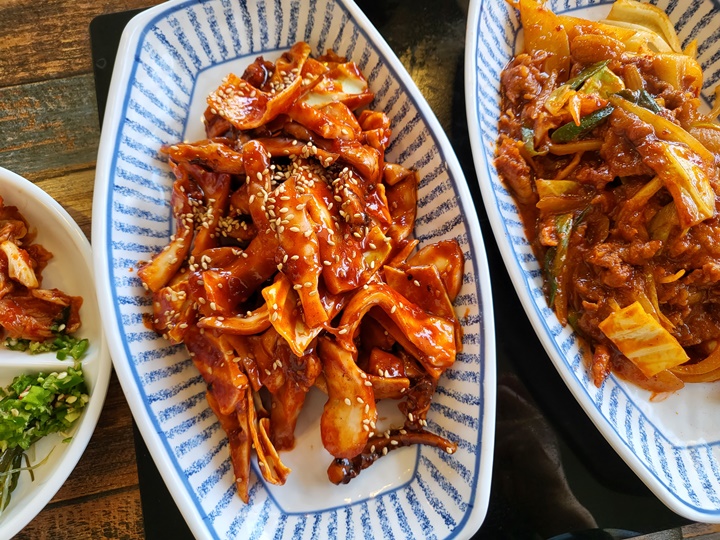 우리는 두루치기세트와 오징어세트를 주문해서 이렇게 두루치기랑 오징어무침이 나온 거. 오징어무침은 좋아해서 남김없이 먹었지만, 두루치기는 못 먹어서 양배추만 집어먹었기 때문에 나올 때 사장님한테 이러저러해서 남겼습니다 말씀드리고 나왔다. 기분 나쁘실까 봐... (아니, 그러니까 못 먹는데 왜 주문해 ㅎㅎㅎ)