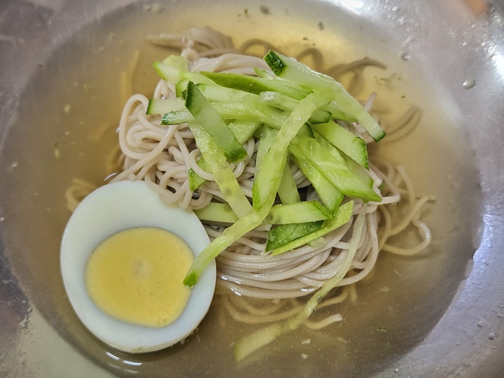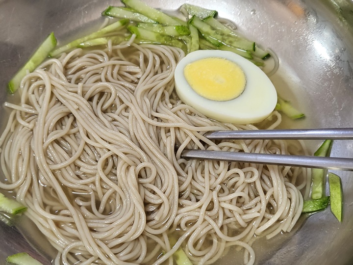 남은 네 덩이 중에서 남편이 둘을 가져갔다. 나는 김가루 넣어서 한덩이, 물막국수로 한덩이 이렇게 먹고 싶었는데 아이가 하나 더 먹고 싶다길래 한덩이만 넣고 물막국수를 만들어 먹었다. 시원한 야채육수 (채수) 부어서 삶은 달걀과 오이채 얹어서 식초, 설탕, 겨자를 넣는다. 메뉴 하나 주문해서 들기름 막국수도 먹고, 물막국수도 즐길 수 있어서 개이득 :)