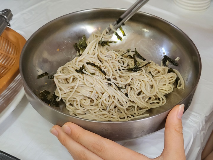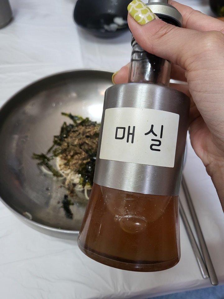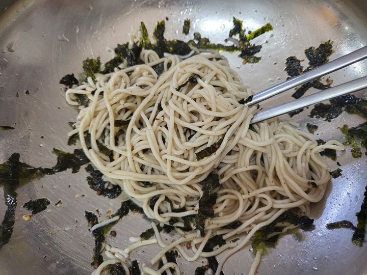 그런데... 아이가 배부르다면서 한덩이 더 못 먹을 것 같다길래 김가루에 들깻가루, 매실을 넣은 순메밀막국수도 먹어볼 수 있게 되었다. 이거 먹고 물막국수로 마무리했으면 더욱 좋았겠지만, 순서가 좀 바뀌어도 뭐 괜찮았다. 역시 김가루와 들깨가루의 위력인지 고소함과 짭조름함이 더해져서 순박했던 맛이 화려해준 느낌이다. 단, 이렇게 먹고 난 후에는 꼭 치아상태 점검해야...
